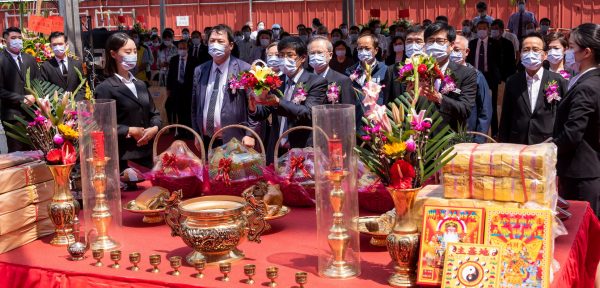 圖二:高雄醫學大學附設高醫岡山醫院舉行工程上梁典禮,由高雄市長陳其邁(前排右)及高醫董事長陳建志(左)率領團隊獻花祝禱祈福。