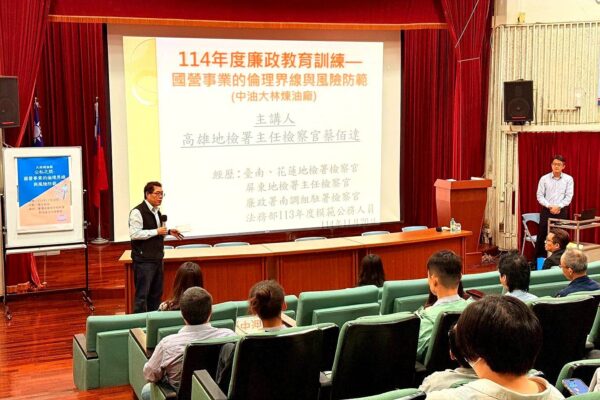 劉大川 / 為深化誠信經營理念,落實企業廉潔文化,中油公司大林煉油廠20日舉辦「公私之間:國營事業的倫理界線與風險防範」廉政講座,邀請臺灣高雄地方檢察署主任檢察官蔡佰達蒞臨演講,針對公務員圖利廠商及涉犯洩密罪、偽造文書罪及貪污治罪條例等案例,與員工進行深入交流與討論。