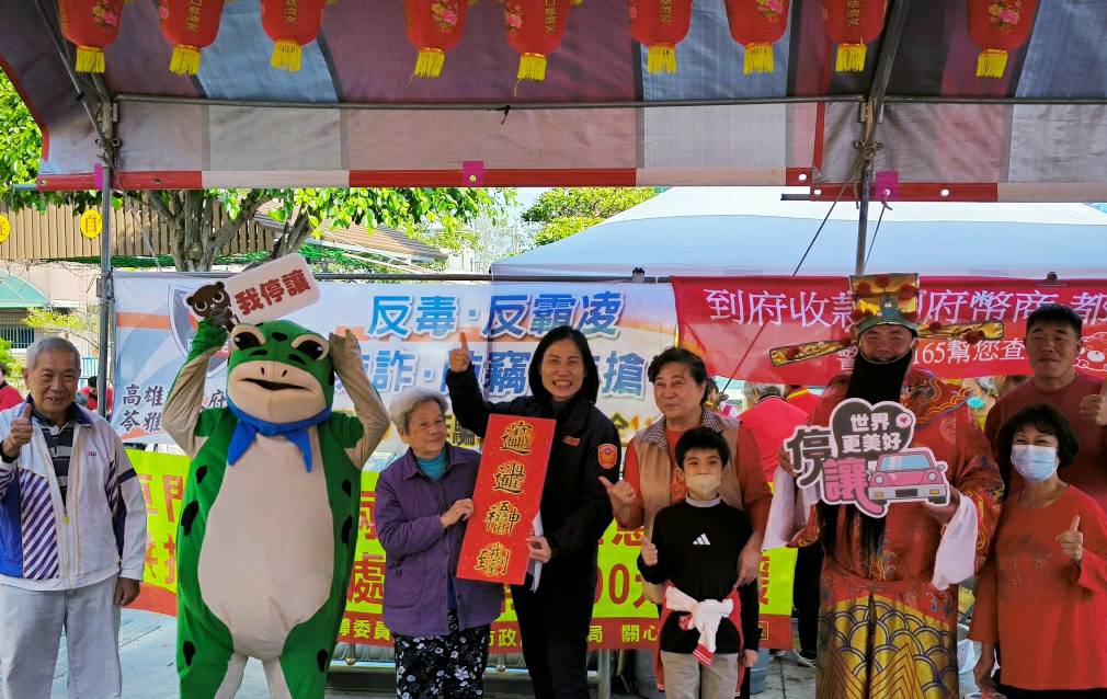 福德二路派出所所長李秀玲、警員李佳芸特別聯繫轄內宮廟,於日前午後至廟埕與絡繹不絕的香客、遊客們進行互動宣導,現場有警察同仁扮成財神爺、青蛙裝的模樣,一同參與宣導,大人小孩看的不亦樂乎。因活動現場家庭長輩較多,宣導議題也著重在詐騙集團電話常使用的話術,呼籲民眾勿輕信假借公家機關名義的來電,依照指示操作匯款,如有異常電話應直撥165或是110向警方求證,民眾歡慶廟宇節慶活動,開心之餘仍要保有警覺性,保護自身荷包。