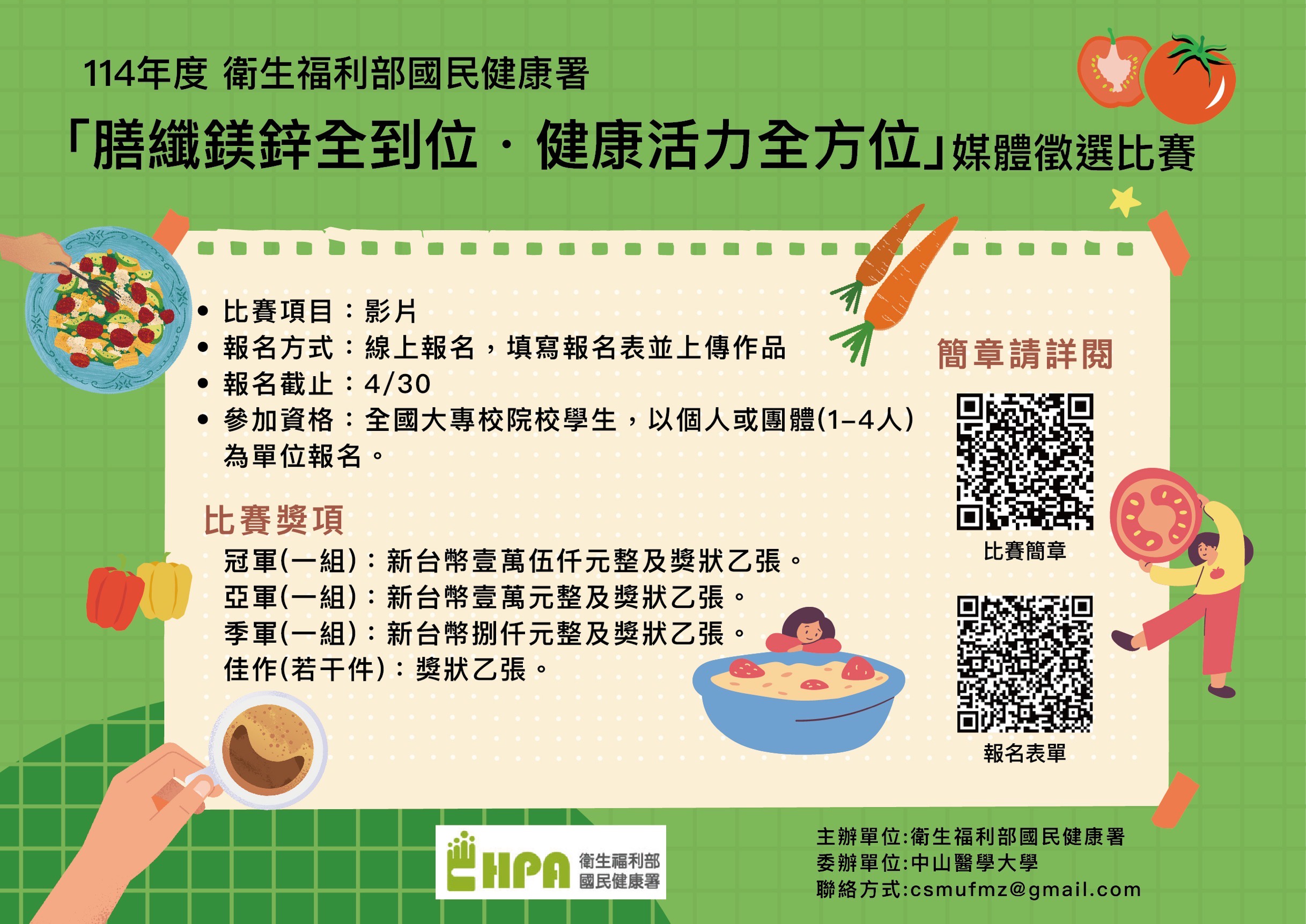 陳文玲 / 為了推廣健康飲食理念,台中中山醫學大學獲得衛生福利部國民健康署的支持,今年受委託舉辦「膳纖鎂鋅全到位,健康活力全方位」創意短片徵選競賽。活動即日起至4月30日開放線上報名,並邀請全國大專校院學生組隊參加。競賽將透過1至3分鐘的創意影片,傳遞有關營養強化的觀念,旨在提升全民的健康意識。