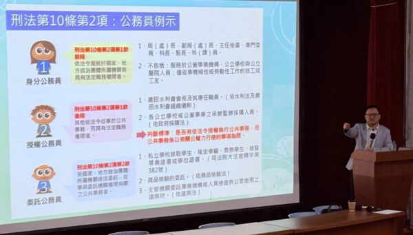 主任檢察官施家榮針對法紀防護、反詐騙及反毒教育等議題以實際案例說明公務執行可能涉及的廉政風險,提醒同仁在工作中應秉持依法行政與廉潔自持原則;同時分析近年常見詐騙手法,如假投資、網路購物詐騙及打工廣告陷阱等,並分享常見之毒品危害及以檢察官視角如何看待藥癮者,提醒同仁提高警覺,避免落入詐騙或毒品陷阱。