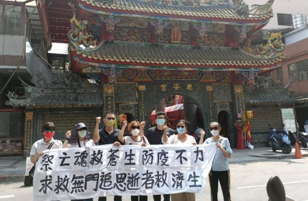 劉大川 / 在傳統習俗中元普渡大拜拜,超渡祖先及四方孤魂野鬼,有數位民眾前往基隆歷史最悠久的慶安宮,為疫情受難者及往生者祈福,隨後聚集在海洋廣場舉牌標語,拉著「祭亡魂、救蒼生、防疫不力,求救無門、追思逝者、救濟生者」白布條,控訴政府官員不要再漠視人權和生命,表達訴求,控訴蔡英文執政黨防疫不力,罔顧民生福祉,要求蔡政府傾聽民意,救蒼生。